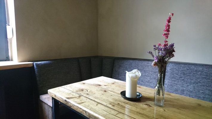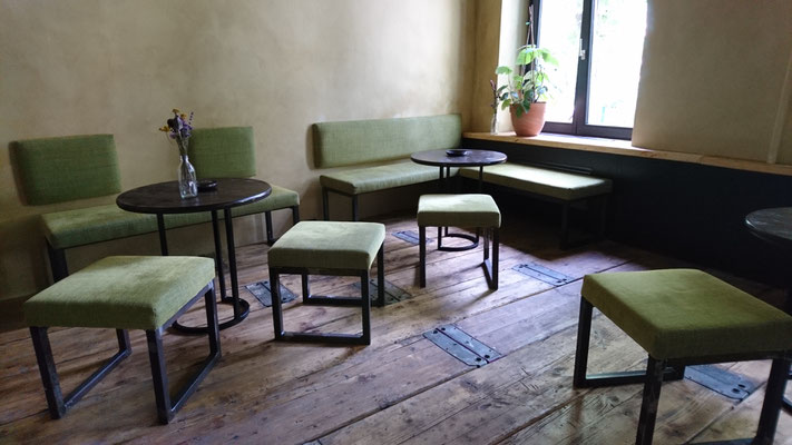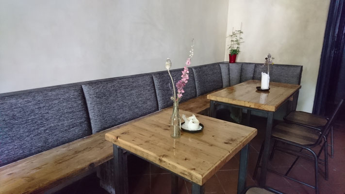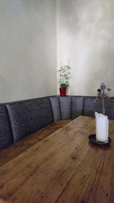 Maßanfertigung der Polster aller Polstermöbel und -einbauten, bestehend aus einigen niedrigen Sitzhockern sowie mehreren Metern Sitzbank und Rückenlehne nach Plänen von Jeannine Simon. Bezugsstoff: Salsa von Hadler & Hollerbuhl.